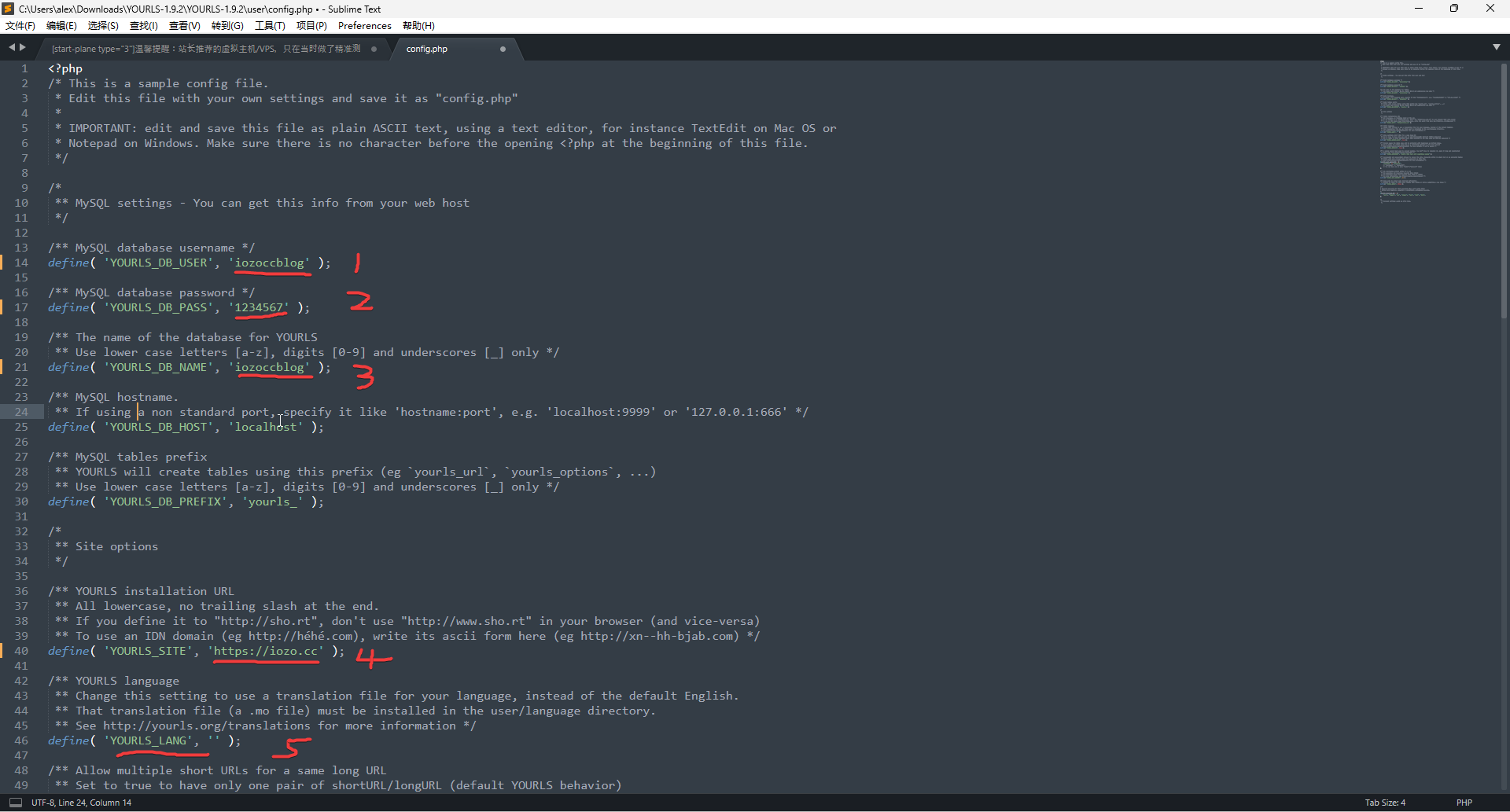 修改数据库信息,登陆密码信息和使用中文,例如: